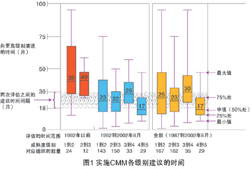 ★ 10個月左右的時間比較常見:根據(jù)SEI官方發(fā)布的統(tǒng)計報告(截止到2002年8月份),從大多數(shù)進(jìn)行評估的組織情況來看,組織從1級向2級改進(jìn)通常需要23個月左右,我們可以通過下面這個圖表來了解各個向高級別演進(jìn)所需要的時間。大家不要被這個接近兩年的時間嚇壞了,這樣的平均時間主要是因?yàn)榇蠖鄶?shù)國外實(shí)施CMM的公司規(guī)模都比較大,項(xiàng)目周期也相對比較長。國內(nèi)大多數(shù)軟件企業(yè)的規(guī)模都不大,加上咨詢公司的幫助,用10個月左右的時間達(dá)到CMM 2級要求還是比較常見的。