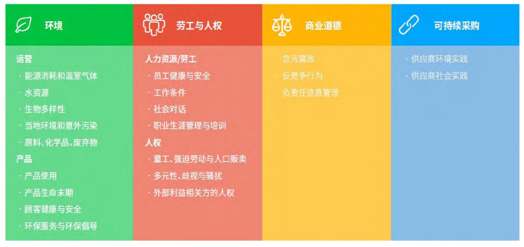 EcoVadis審核的企業(yè)社會(huì)責(zé)任指標(biāo)分為5個(gè)主題(環(huán)境和安全、社會(huì)責(zé)任:勞工和人權(quán)、商業(yè)道德、可持續(xù)發(fā)展、聯(lián)合國(guó)契約)。