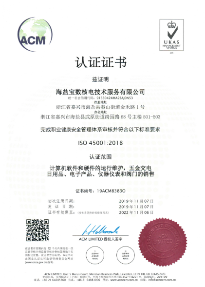 2019年11月07日海鹽寶數(shù)核電技術(shù)服務(wù)有限公司取得ISO9001認(rèn)證、ISO14001認(rèn)證和ISO45001認(rèn)證證書。