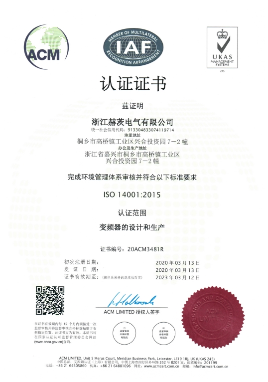 2020年03月13日浙江赫茨電氣有限公司順利取得ISO14001環(huán)境管理體系認(rèn)證證書。在當(dāng)今環(huán)保政策的不斷加強(qiáng)下,對公司環(huán)境保護(hù)工作的要求也越來越高。在赫茨公司領(lǐng)導(dǎo)的關(guān)注下,近日,公司順利通過了ISO14001環(huán)境體系認(rèn)證,標(biāo)志著公司在環(huán)境管理方面達(dá)到了國際水平。